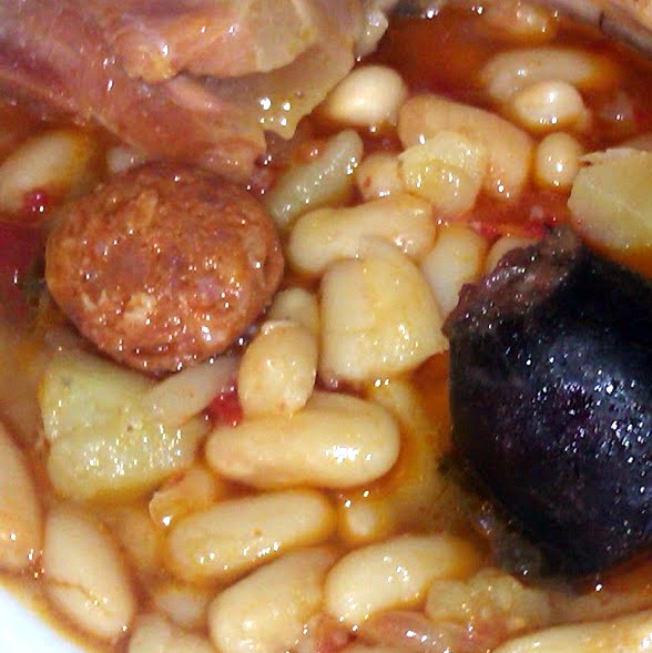 Servir las alubias calientes, en plato hondo, con los trozos de chorizo, panceta y morcilla encima.